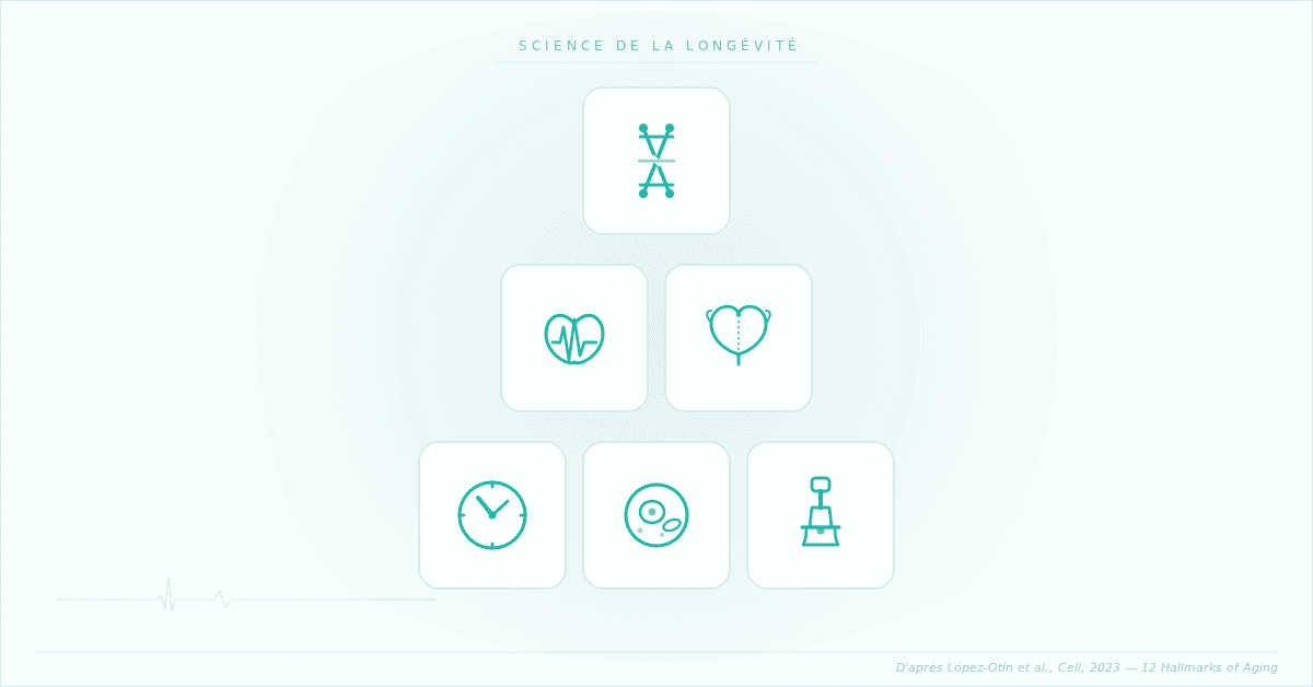 Ces dernières années, la recherche a posé un cadre solide : les “Hallmarks of Aging” (López-Otín et al., Cell, 2023) identifient 12 mécanismes du vieillissement biologique comme l'instabilité génomique, la sénescence cellulaire, les dysfonctions mitochondriales, ou encore l'”inflammaging”, cette inflammation chronique silencieuse qui prépare le terrain des grandes pathologies.